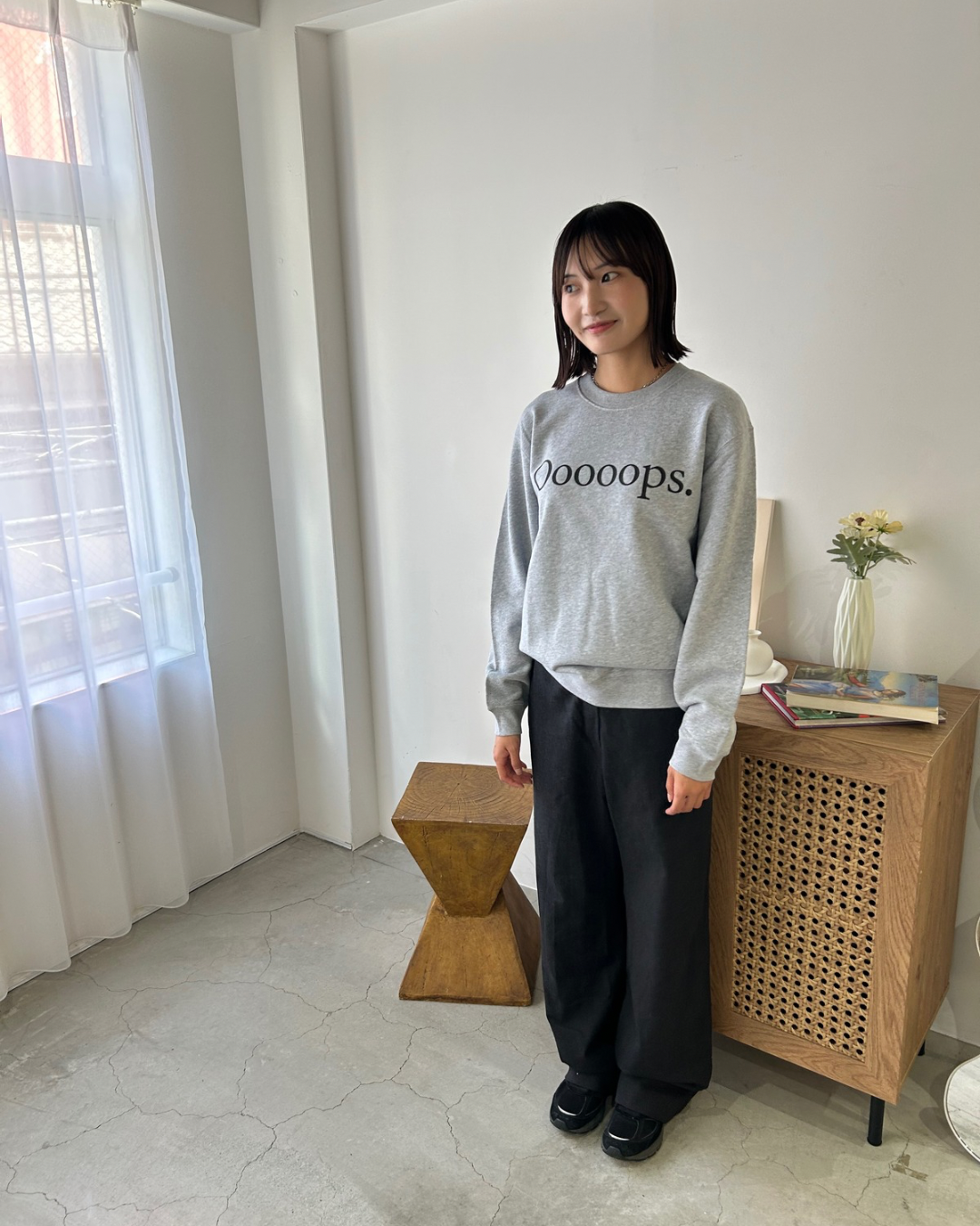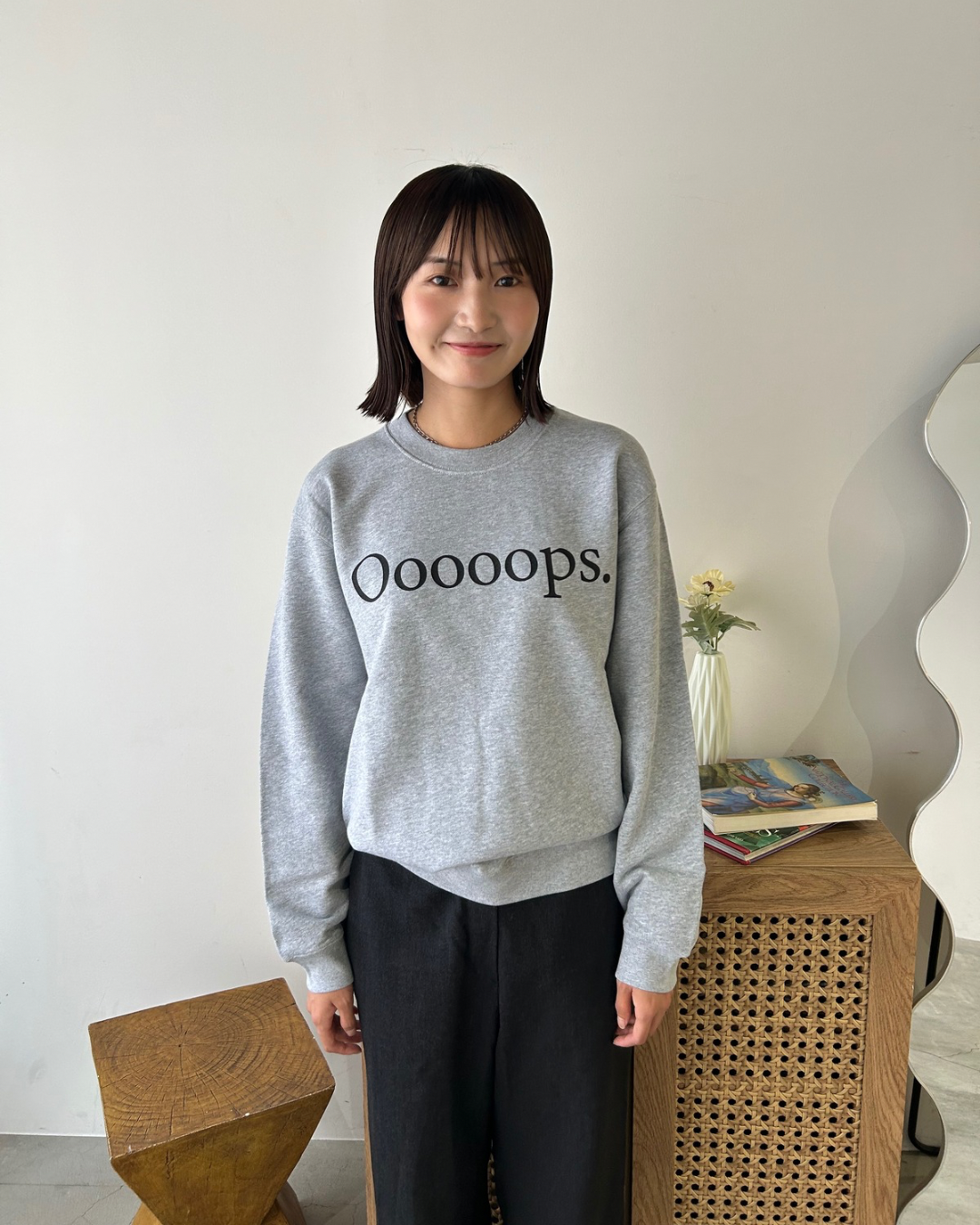 10oz , コットン100%のスウェット”Ooooops.”と大胆にシルクスクリーンプリントを施しております。